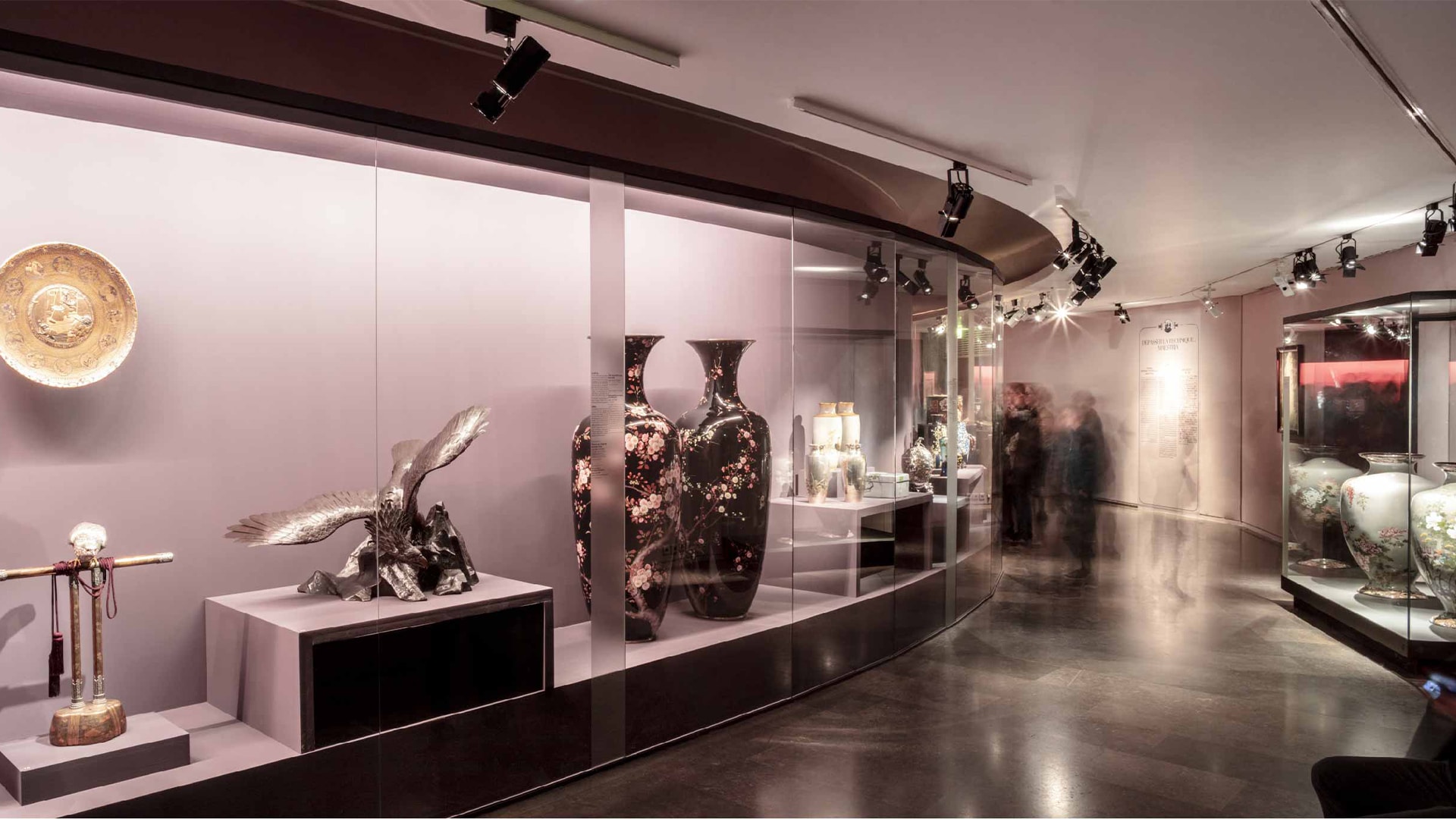 The path traced by the agency guides the visitor to the discovery or rediscovery of these cultural and artistic treasures. Linear but sinuous, it reflects the cultural, political and social evolution of the Meiji era, the force that the opening to the world and modernization represented for the Japanese society of the time and that they exerted on the European imagination. The choice of colors accompanies the theme of each room, as many chromatic echoes sublimating the exhibited pieces, whose material, formal and/or stylistic variety imposes a singular attention to their lighting and their layout. The alternation of spaces, the play of partitions and transparency, the wandering around the objects allows visitors to physically confront these masterpieces. At the end of the tour, the scenography allowed visitors to observe “from all angles” the splendors of imperial Japan.