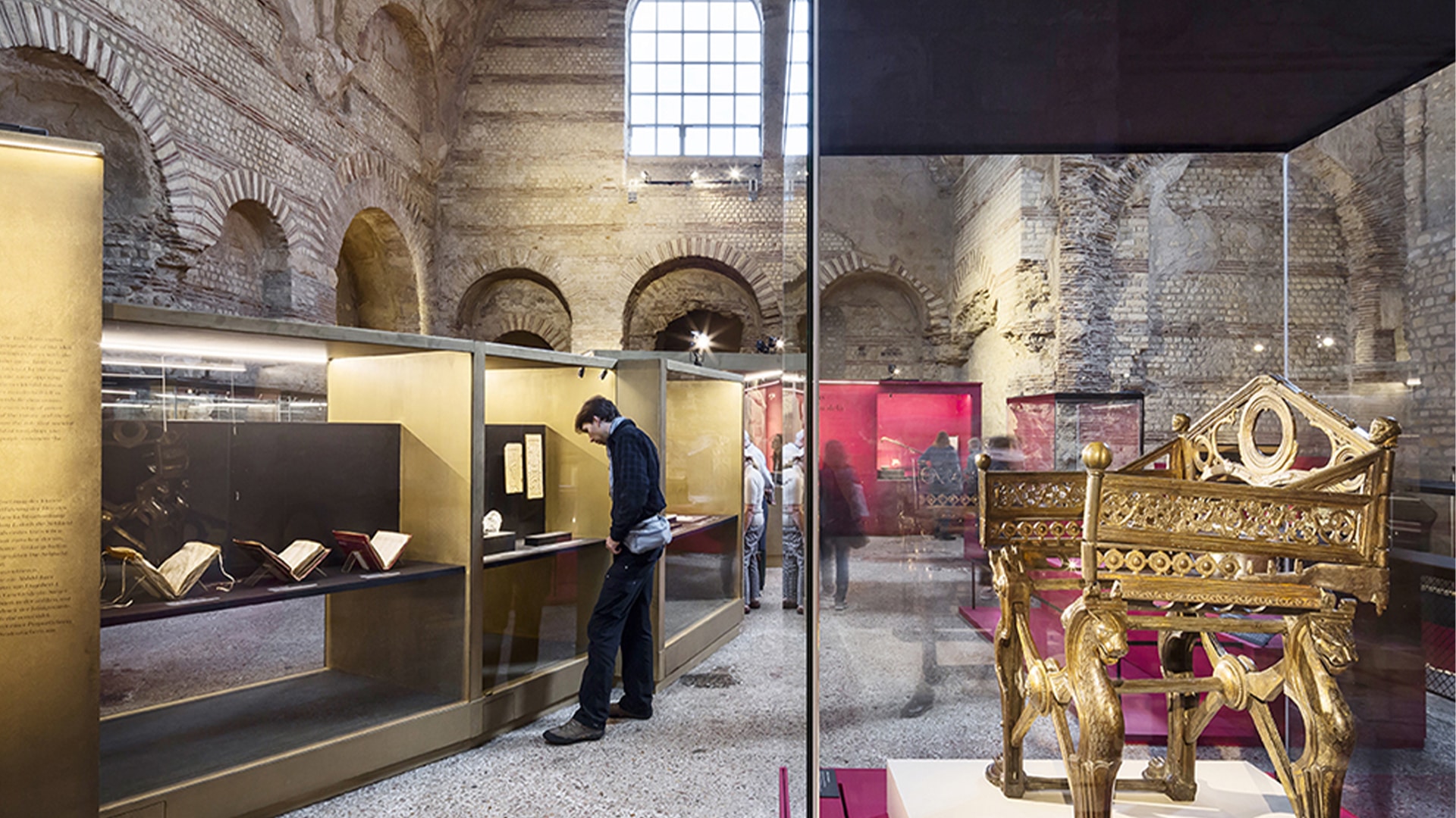 The main scenographic intention is to reveal the content of the exhibition, the works of the exhibition which testify to Merovingian art and culture, and the place of the exhibition, the frigidarium which is a place already visited.