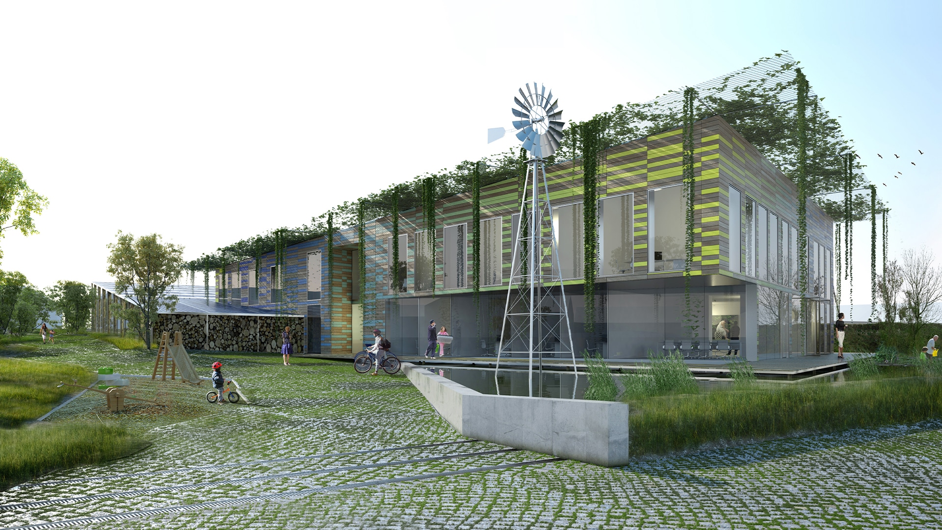 Passive, the building is designed as a didactic tool, a practical guide to ecology for the city’s inhabitants. The wind turbine, the retention basin, the valleys, the solar panels, the compost, the wood boiler room, the green roof, the wood siding, the double flow, the wood frame, the Canadian well: all these elements are visible to the public.