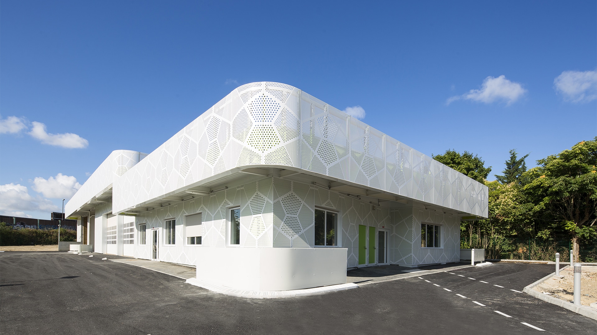 The structure of the building is a steel post and beam structure. The roofing of the building is composed of a complex of vegetated roofing. The facade is made of white lacquered perforated metal sheeting with a colored rain screen behind. The degree of perforation is variable according to the graphic design of the façade panels.
