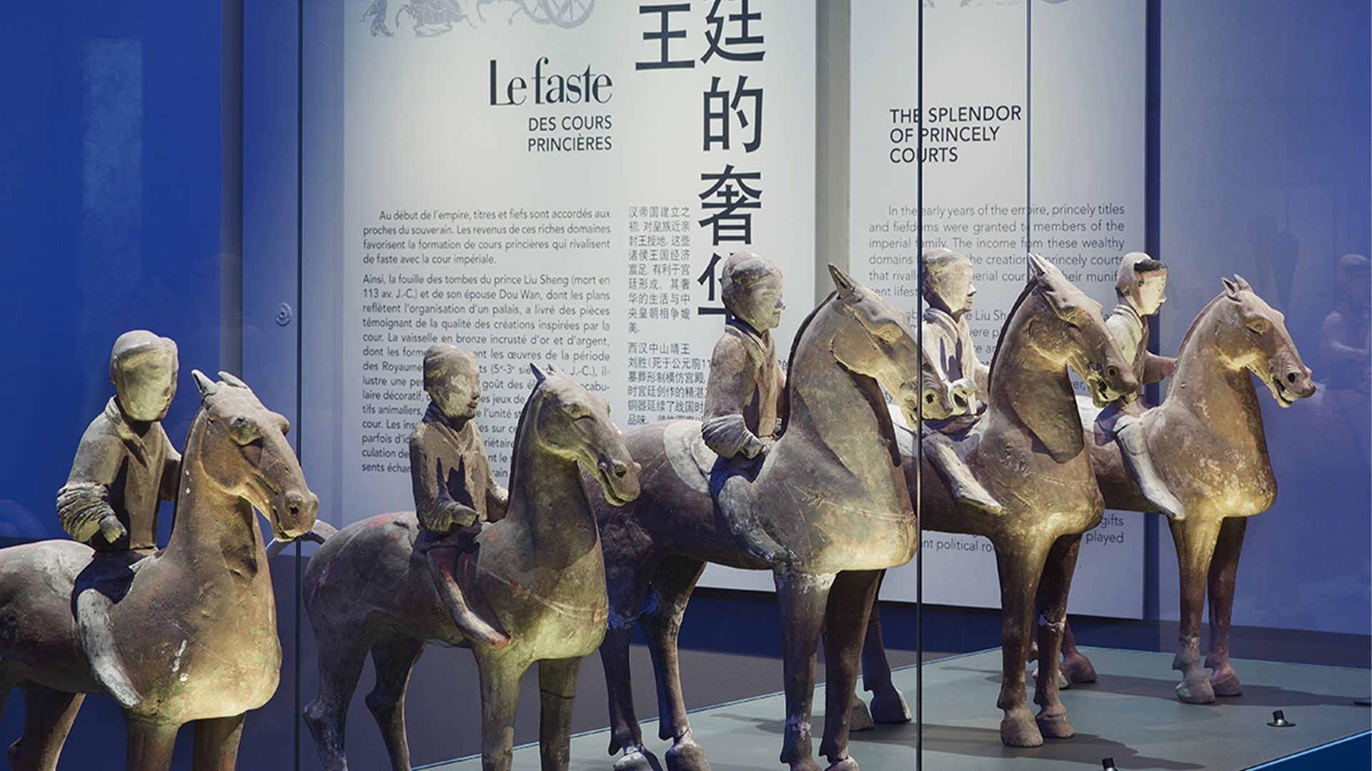 La première salle aborde la figure du souverain. Les objets présentés sont majoritairement des statuettes funéraires. Le dispositif scénographique s’inspire de la façon dont les statuettes sont entreposées dans les chambres funéraires Han et de la trame des estampes de l’époque. Les œuvres sont présentés sur des plots autour desquels la déambulation est libre.